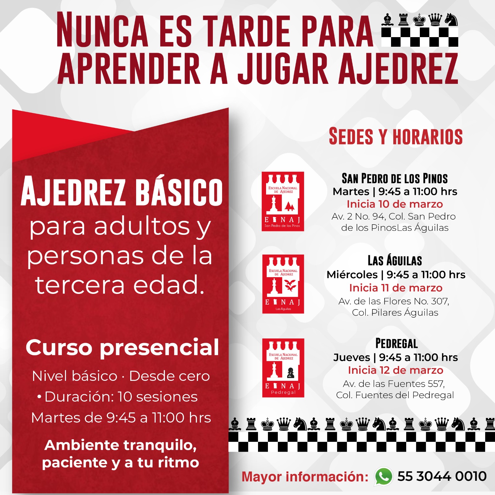 Te invitamos a participar en este curso de 10 sesiones que la Escuela Nacional de Ajedrez presenta especialmente para adultos y personas de la tercera edad.